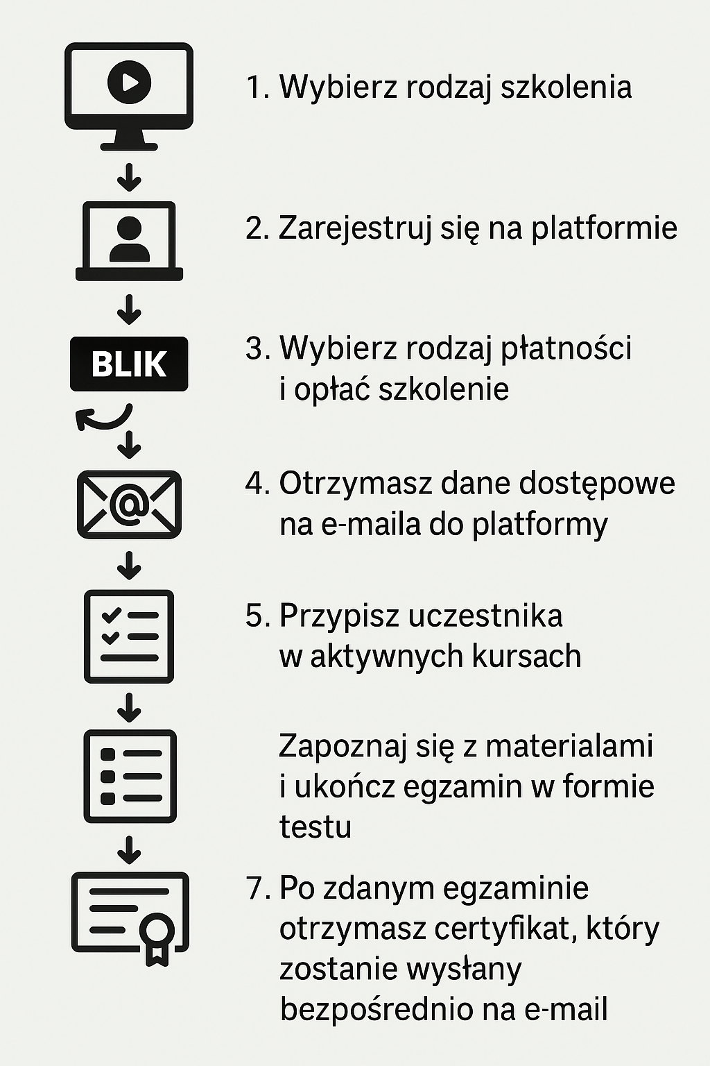Zaświadczenie: elektroniczny certyfikat ukończenia szkolenia BHP wysyłany natychmiast po ukończeniu egzaminu na adres e-mail uczestnika. Dokumenty generowane są automatycznie po zaksięgowaniu płatności.